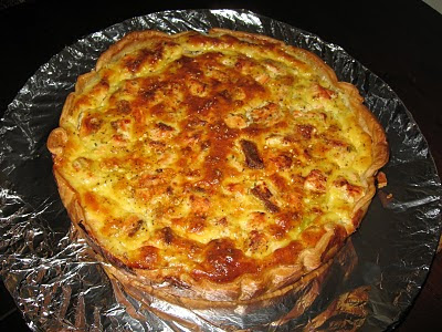 4. Numa tarteira com fundo amovível, estenda a massa. Com a ajuda de escumadeira, coloque o salmão por cima da massa. Por cima do salmão, espalhe o alho francês.